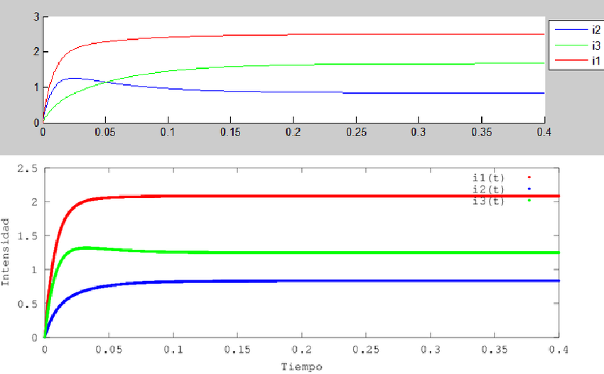 - El valor de \(i_3\) crece mas rápidamente aumentando \(R_3\) estabilizándose rápidamente.