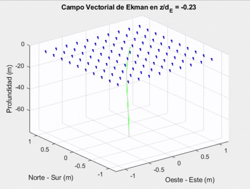 En el siguiente apartado desarrollaremos una simulación animada en MATLAB que represente la evolución del campo vectorial de velocidad v a lo largo de la columna de agua, utilizando una secuencia de planos horizontales distribuidos entre la superficie del océano y la profundidad de Ekman.