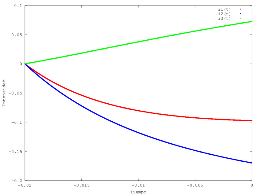 Con este programa podemos observar la evolucion de las intensidades en el periodo inicial del circuito siendo los valores correspondientes \(i_1\) = -0.097294, \(i_2\) =0.16982 e \(i_1\) = -0.07256.