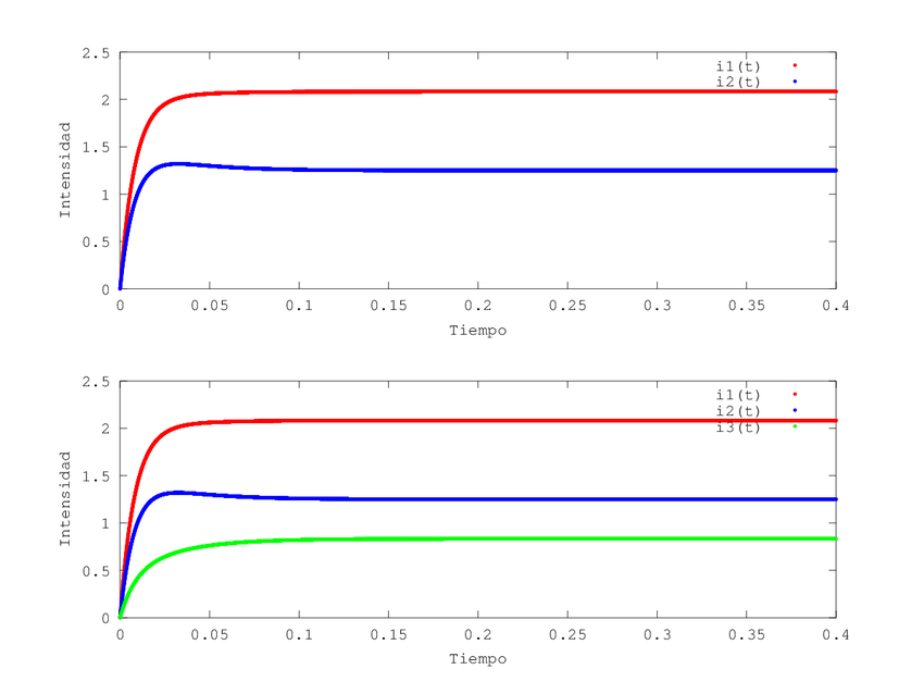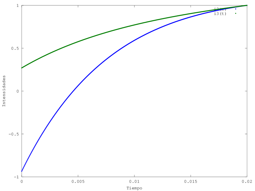 Podemos observar que a partir de \(t=0.15\) todas las intensidades tienden a estabilizarse. El comportamiento inicial, justo al conectar la corriente, es lo que difiere de todas ellas; mientras que \(i_1 (t)\) va aumentando mas rápido al principio la función de \(i_2 (t)\) no aumenta con tanta rapidez, observándose un pequeño descenso en la gráfica obtenida
