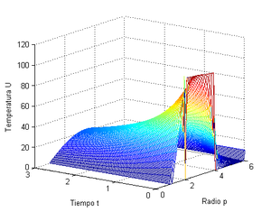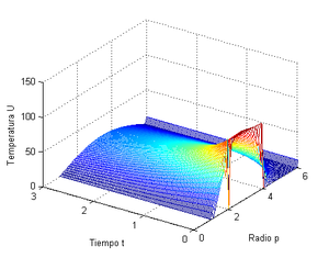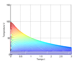 Vamos a dibujar el comportamiento de la temperatura para un radio constante \(\rho=3\) en una gráfica 2-D (eje de abcisas, temperatura y eje de ordenadas, tiempo). Para ello, utilizamos el siguiente código MATLAB: