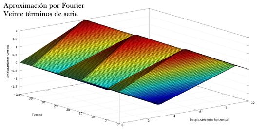 En la resolución del problema emplearemos de nuevo la condición inicial de sujetar el cable por el centro y elevarlo 2 m perpendicularmente: [math] u(x,0)=g(x)= 2- |\frac{2}{5}x -2| [/math]