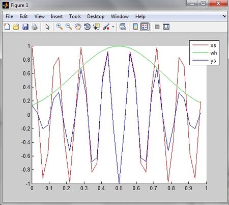 clear all %frecuencia de muestreo Fs=32; %intervalo t=0:1/Fs:1-1/Fs; %frecuencia señal F0=-7; %senal xs=exp(i*2*pi*F0*t); %ventana de Gauss P=32; n=0:1:P-1; t1=0:1/32:1-1/32; wh=exp(-0.5*((n-P/2)/(P/4)).^2); %multiplicacion ys=xs.*wh %dibujar hold on plot(t,xs,'r') plot(t1,wh,'g') plot(t,ys) legend('xs','wh','ys')