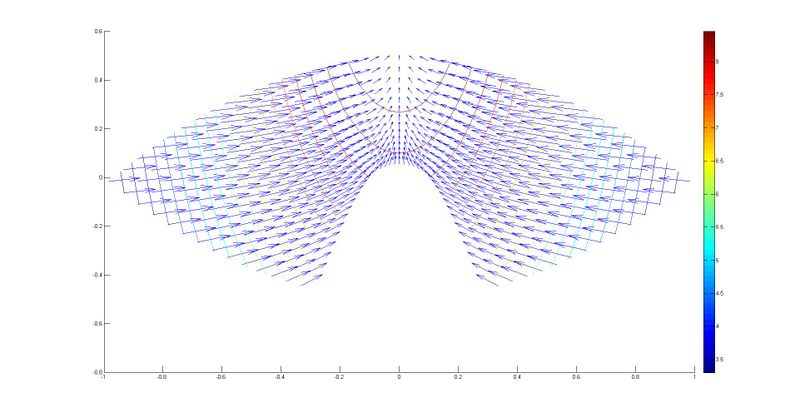 Y ya se pueden sustituir todos los términos en la expresión de la divergencia. El resultado final es [math]\nabla\cdot\vec u = -2\frac{3u^2+v^2}{u^2+v^2}[/math]. Dado que el resultado es negativo se puede concluir que existen sumideros en el flujo que atraviesa el campo vectorial [math]\vec{u}[/math]. Ésa es la expresión que se utilizará en el código de Matlab.