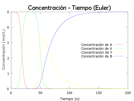 legend('Concentración de A','Concentración de X', 'Concentración de Y', 'Concentración de B', 'location','best')