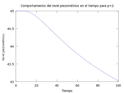 Ahora supondremos que [math] \rho [/math] es constante y que su valor es 2 y dibujaremos el comportamiento del nivel piezométrico en una gráfica 2D nivel piezométrico-tiempo.
