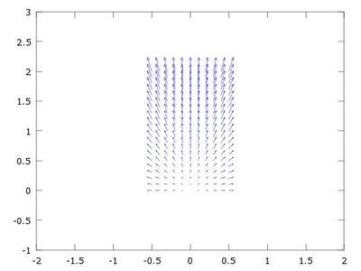 We show how to visualize vector fields on plane regions, representing solids, with Octave UPM. We focus on the example in Dibujar un sólido 2-D, i.e. the rectangle [math] [-1/2,1/2]\times [0,2][/math] and the vector field [math] f(x,y)=x\vec i + y \vec j[/math]. We follow the steps: