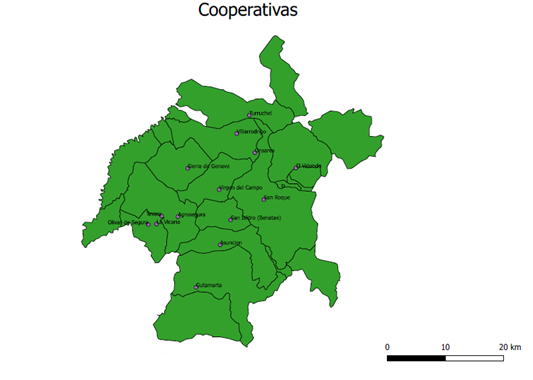 • Distribución según la cercanía de las distintas almazaras a las áreas de cultivo. Se ha optado por este método, que aunque menos preciso, puede servirnos como primera aproximación para la nueva planta de biomasa.