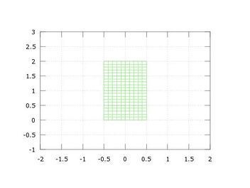 Dibujaremos un mallado que represente los puntos interiores del rectángulo [0, 8] × [−1, 1] ocupado por un fluido. Fijaremos los ejes en la región [0, 4] × [−2, 2]. El código para crear el programa aparece a continuación, junto con su representación gráfica: