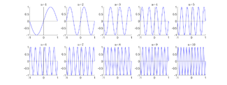 En la figura anterior se aprecia cómo según aumenta el valor de [math] n [/math] el periodo de la función va disminuyendo. Esto también se puede ver fácilmente a partir de la expresión analítica: