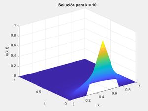 title('Solución para k = 10');Se puede observar como la representación de la solución final es muy similar a la que sería la representación en [math]R^{3} [/math] de la solución estacionaria, en el intervalo[math][0.2,1] [/math]. Fuera de este, la solución no se asemeja a la solución estacionaria. Debido a esto, debemos señalar que la solución obtenida del problema modificado, la [math]w(x,t) [/math], será similar al plano generado en [math]x=0[/math], fuera del entorno de [math]t=0 [/math], ya que como hemos visto, en el intervalo [math][0,0.2] [/math] la gráfica de [math]u(x,t) [/math] no se asemeja a la solución estacionaria.