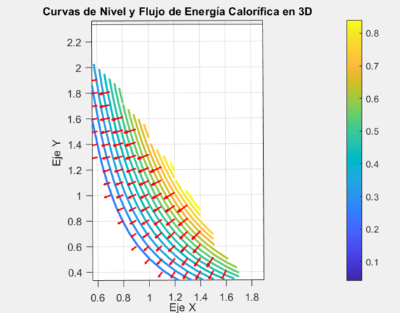 De acuerdo a la Ley de Fourier la energía calorífica <math> \vec{Q} </math> viaja de acuerdo a la fórmula <math> \vec{Q}=−κ∇T </math>, donde <math> κ </math> es la constante de conductividad térmica de la placa que supondremos <math> κ=1 </math>. Para poder calcular la energía calorífica, primero debemos de calcular el gradiente de la temperatura, que viene dada por: <center><math>T(x, y) = \frac{y \cdot x^2}{2}</math></center>. | De acuerdo a la Ley de Fourier la energía calorífica <math> \vec{Q} </math> viaja de acuerdo a la fórmula <math> \vec{Q}=−κ∇T </math>, donde <math> κ </math> es la constante de conductividad térmica de la placa que supondremos <math> κ=1 </math>. Para poder calcular la energía calorífica, primero debemos de calcular el gradiente de la temperatura, que viene dada por: <center><math>T(x, y) = \frac{y \cdot x^2}{2}</math></center>. | ||