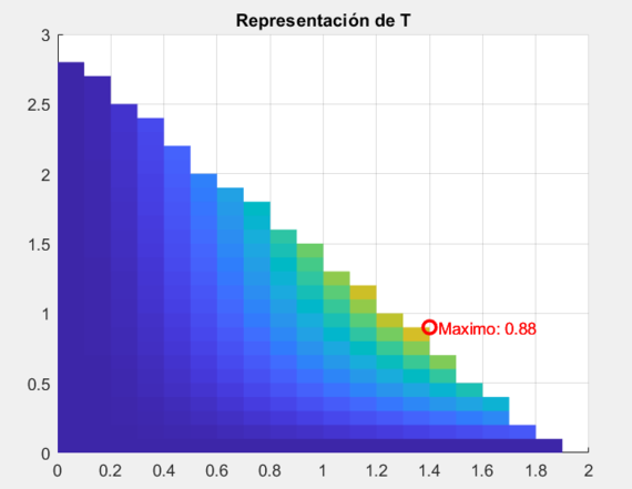 La temperatura máxima alcanzada es de 0.88 y se alcanza en los puntos (61,1) y (61,61)