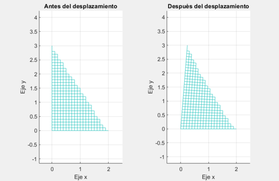 A continuación se incluye la representación del sólido previa al movimiento y después del movimiento, así como una figura que contiene la representación del sólido previa y tras el desplazamiento, para lo que se ha utilizado el comando subplot. Se han utilizado datos definidos en el apartado anterior. También se adjunta el programa de Matlab utilizado para la representación.