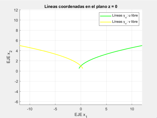 Las líneas coordenadas asociadas a \(u\) y a \(v\) son curvas que tienen forma de parábolas parametrizadas por (\(u\),\(v\))