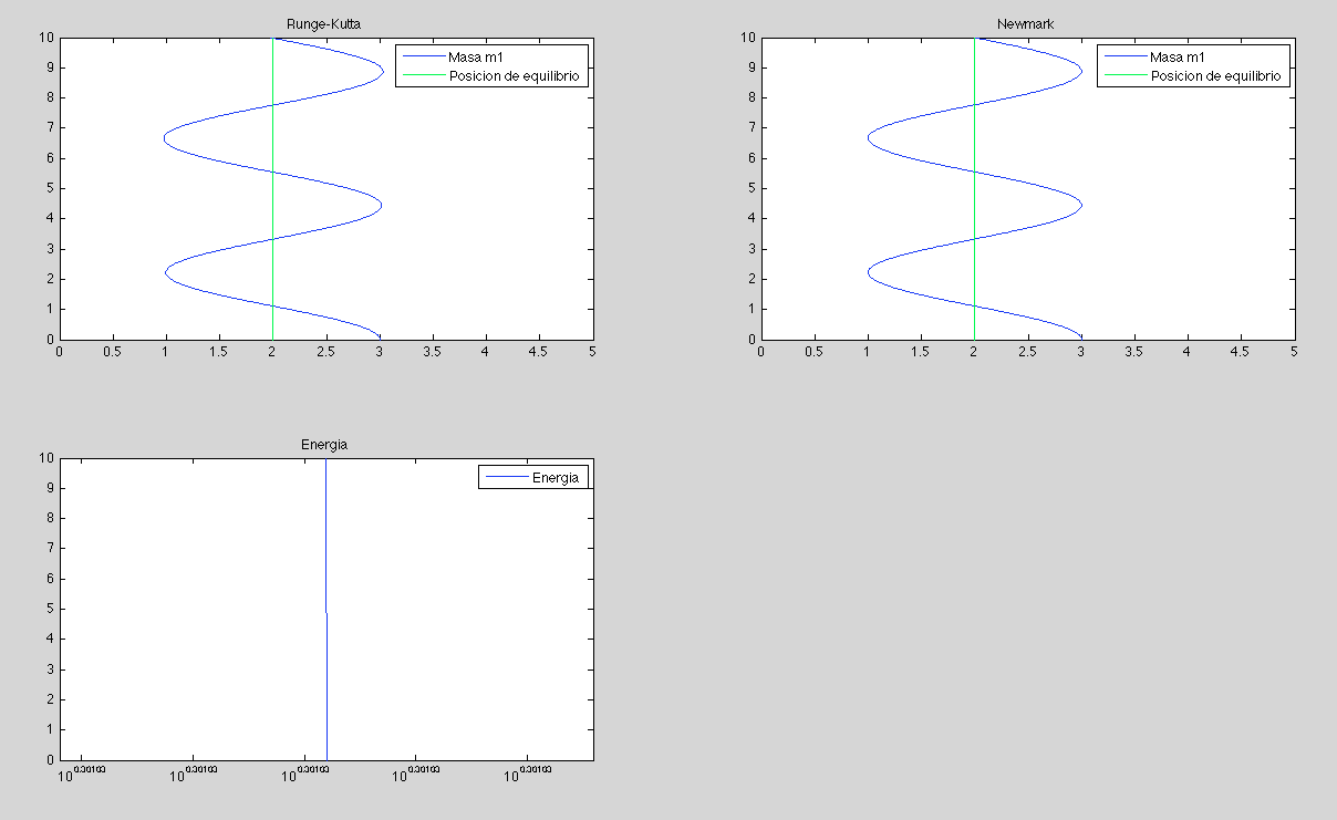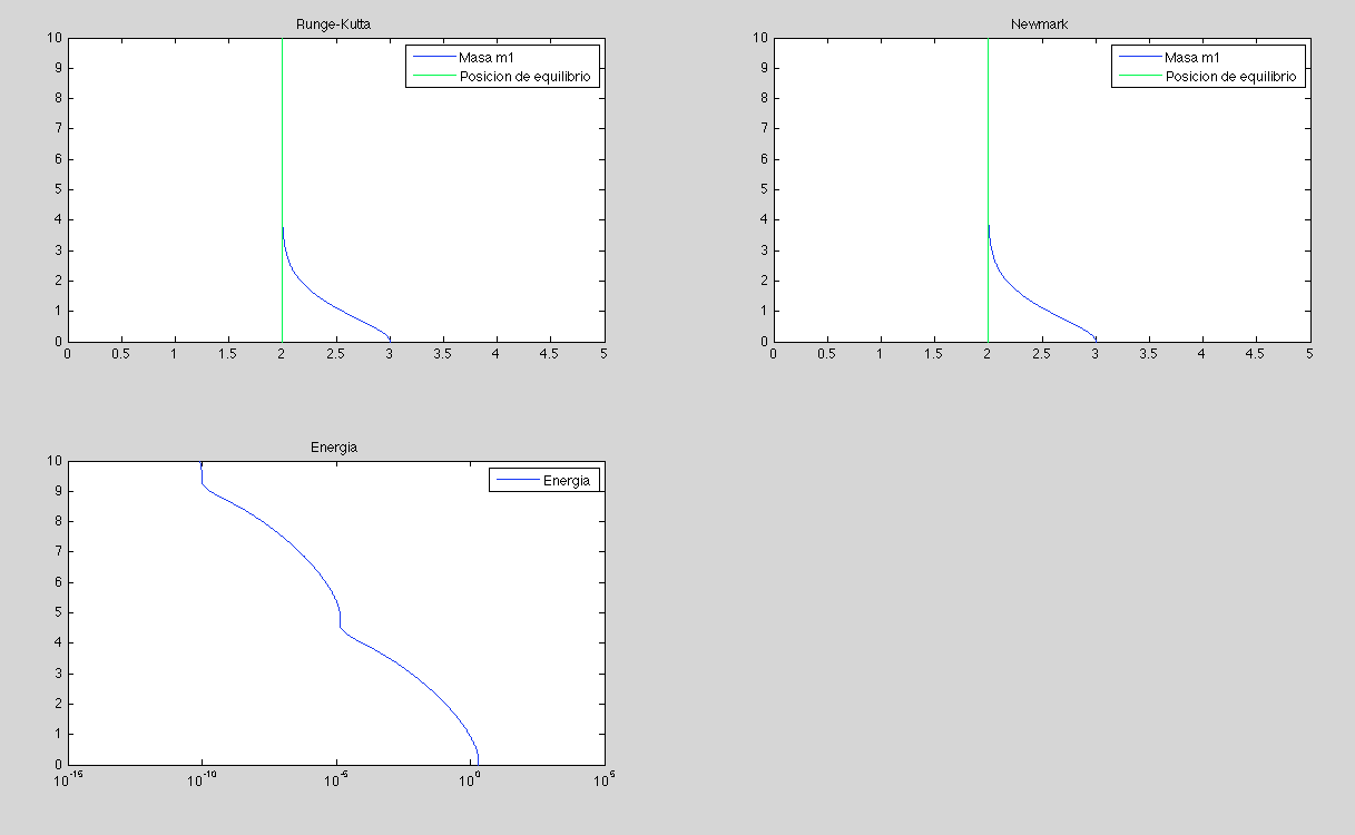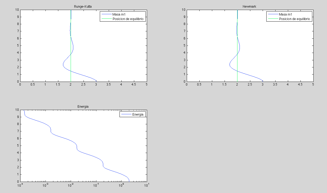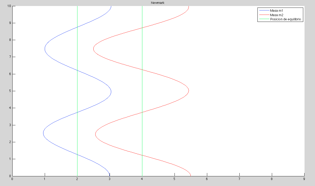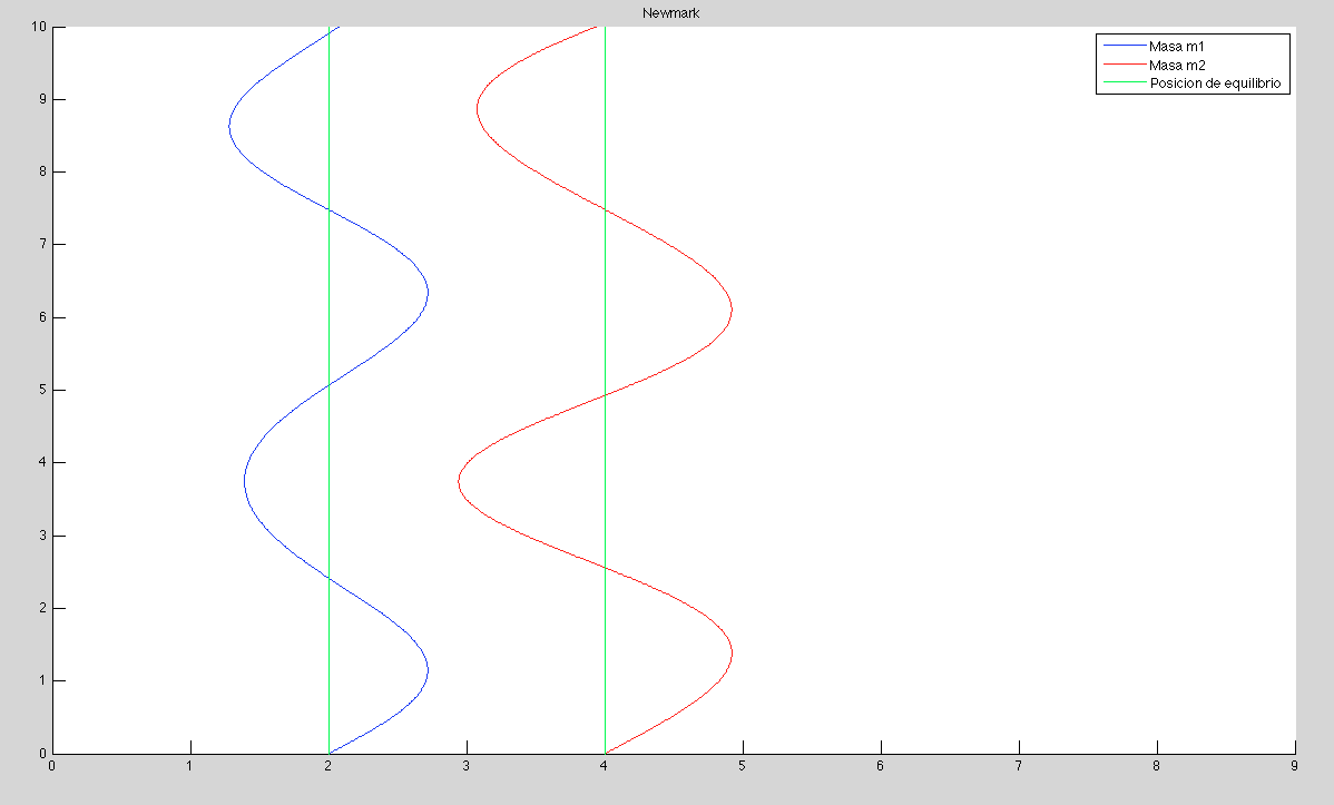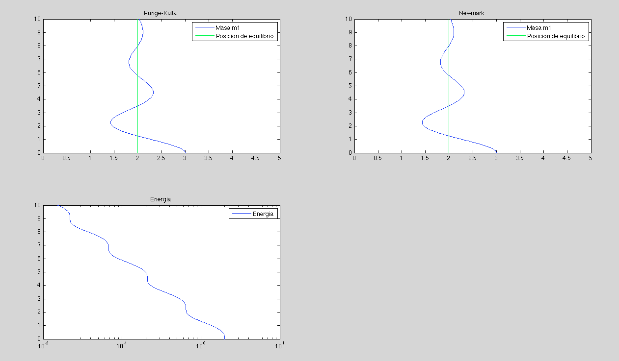 [math]m_{1}=2~[kg][/math]: [math]k_{1}=4~[N/m][/math]: [math]\mu=c=1[/math] La ecuación se resuelve en MATLAB aplicando los metodos de Newmark y de Runge-Kutta