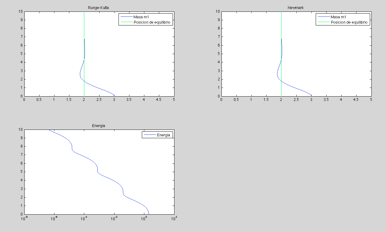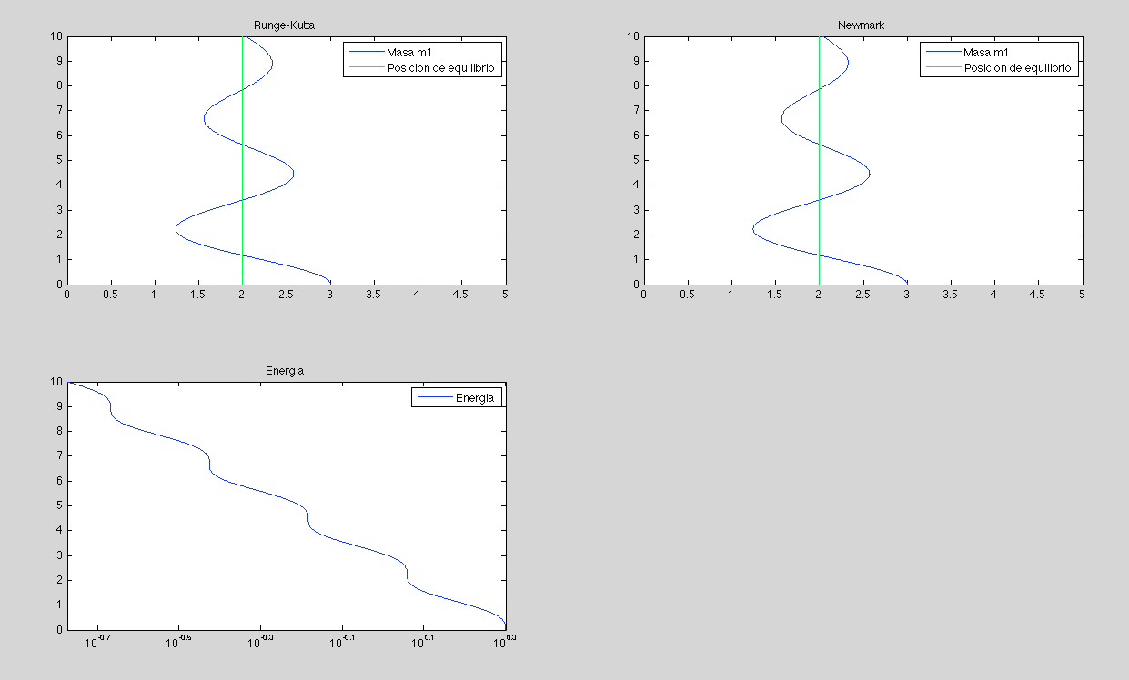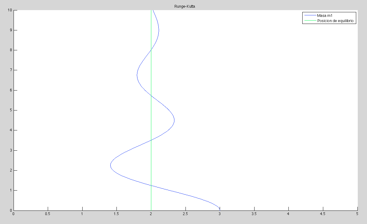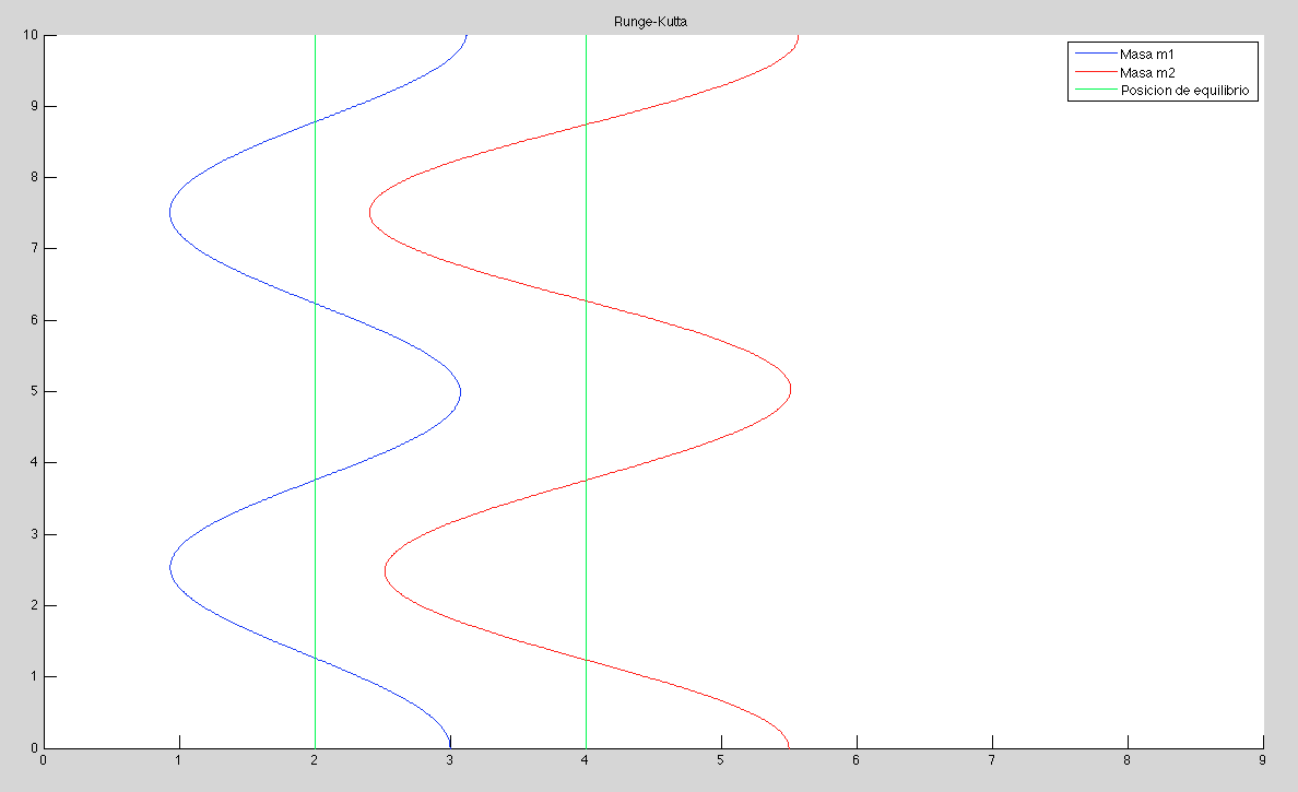Al igual que con el metodo de Newmark, para aplicar Runge-Kutta al problema es necesario reducir el orden de la ecuacion, por lo que realizamos el mismo cambio de variable y, por consiguiente, obtenemos el mismo sistema de ecuaciones:: [math]m_{1}\dot x=-(k_{1}+k_{2})x+k_{2}y[/math]: [math]m_{2}\dot v=k_{2}x-(k_{2}+k_{3})y[/math]: [math]\dot x=u[/math]: [math]\dot y=v[/math] El código en MATLAB resulta: