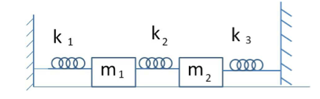 El caso considerado está formado por tres muelles y dos masas, unidos a dos paredes separadas 9 metros, que se deslizan sin rozamiento sobre un plano horizontal.