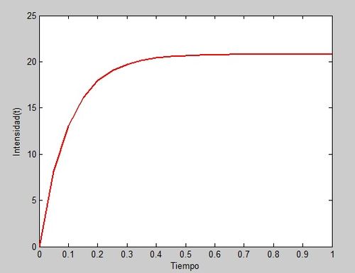 Podemos ver en la gráfica de la función que la evolución de la intensidad, una rápida subida en los primeros instantes que se ralentiza hasta llegar a ser prácticamente constante con un valor de 4.