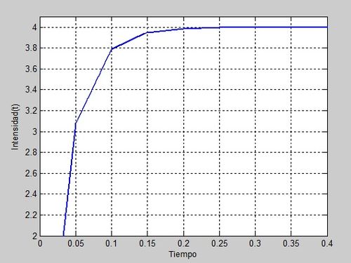Podemos ver en la gráfica de la función que la evolución de la intensidad, una rápida subida en los primeros instantes que se ralentiza hasta llegar a ser prácticamente constante con un valor de 4.