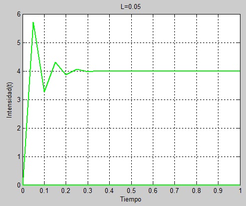 De igual forma al reducirlo, la subida de la intensidad hasta llegar a una cifra constante es mucho mayor, aumenta el periodo transitorio; sin embargo, la función deja de ser exponencial convirtiéndose en fluctuaciones de rectas que van reduciendo su volatilidad con el paso del tiempo.