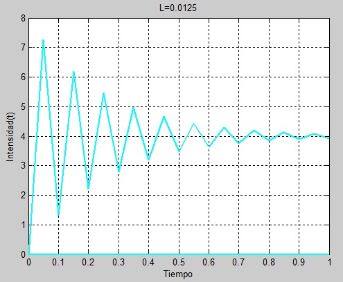 De igual forma al reducirlo, la subida de la intensidad hasta llegar a una cifra constante es mucho mayor, aumenta el periodo transitorio; sin embargo, la función deja de ser exponencial convirtiéndose en fluctuaciones de rectas que van reduciendo su volatilidad con el paso del tiempo. | De igual forma al reducirlo, la subida de la intensidad hasta llegar a una cifra constante es mucho mayor, aumenta el periodo transitorio; sin embargo, la función deja de ser exponencial convirtiéndose en fluctuaciones de rectas que van reduciendo su volatilidad con el paso del tiempo. | ||
