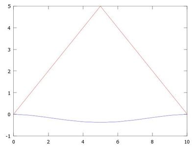 <math> L=10 \  ;  \ E= 5*10^4 \  ;  \ M(x)= L/2- | x- L/2 | \  ;  \ I(x)= \frac {a*b^3}{12}  </math>