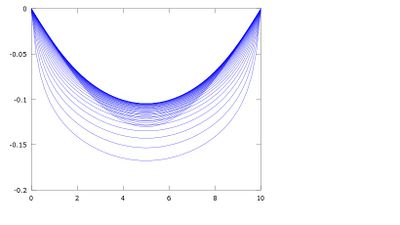 Como se puede ver en la siguiente gráfica, el punto de mayor deflexión es en el centro de vano (x=5 m)  y de valor absoluto 0.16013 en sentido negativo del eje.