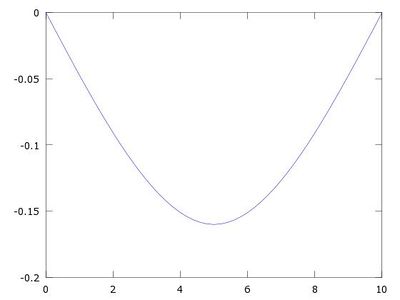 Como se puede ver en la siguiente gráfica, el punto de mayor deflexión es en el centro de vano (x=5 m) y de valor absoluto 0.16013 en sentido negativo del eje.