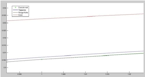 | + | legend('Función real','Trapecios', 'Runge-Kutta', 'Euler','Location','best'); | ||