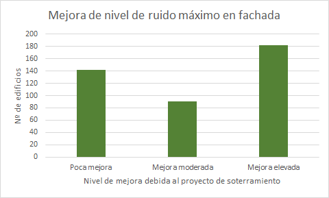 Para ilustrar este punto, se muestra otro mapa con los edificios que ven su nivel de ruido en fachada mejorado por la obra de soterramiento y que tanto se mejora.