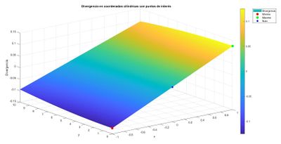 title('Divergencia en coordenadas cilíndricas con puntos de interés');