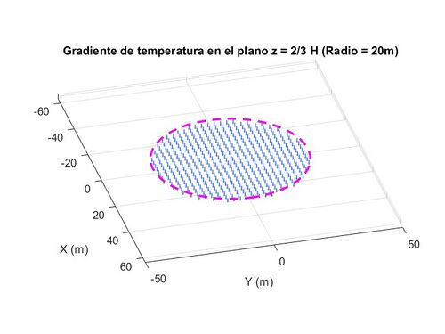 Dentro de la torre, el aire caliente asciende por convección natural. Modelamos el campo de temperatura (en °C) como: