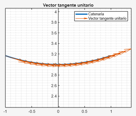 EL vector tangente de un punto de la catenaria, describe la dirección de la curva en ese preciso punto. Para determinar el vector tangente se emplea de nuevo la primera derivada, con la que se saca la pendiente. Como estamos trabajando con vectores unitarios, tendremos que dividir entre el módulo.