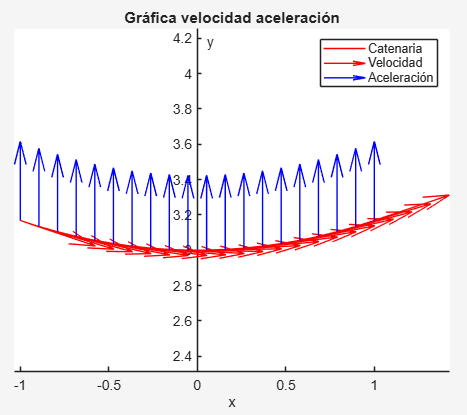 La velocidad representa la rapidez con la que el punto parametrizado se mueve a lo largo de la curva. Sin embargo, el vector aceleración representa la tasa de cambio del vector velocidad a medida que el punto se mueve a lo largo de la curva y su orientación hacia arriba refleja que la función hiperbólica incrementa rápidamente en ambas direcciones de t.