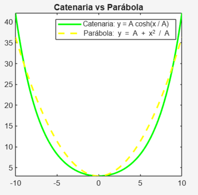 legend('Catenaria: y = A cosh(x / A)', 'Parábola: y = A + x^2 / A');
