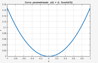 [math] γ(t)=(t,3cosh(t/3))[/math], que corresponde a la catenaria de parámetro A=3, con [math] t\in(-1,1) [/math]