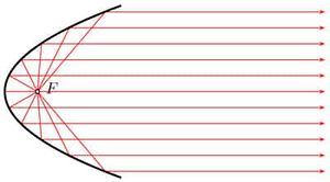 Una de las características esenciales de la parábola es su poder de reflexión: cualquier rayo que llegue de forma paralela a su eje se desvía de tal manera que termina pasando por su foco.