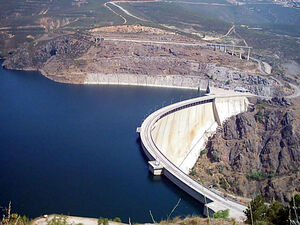 1.2. Presas de Bóveda. En este tipo de presas, las fuerzas horizontales generadas por la presión de la columna de agua se distribuyen hacia los laterales de la presa donde se presupone un buen material de recepción que soporte estas cargas. Un ejemplo significativo es la presa del Atazar en Madrid en el paso del Rio Tajo.