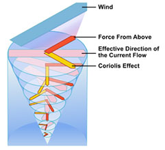 En el hemisferio norte cada capa de agua se mueve ligeramente hacia la derecha respecto a la capa superior, mientras que su velocidad disminuye en función de la profundidad por la fricción interna. Esto provoca una estructura helicoidal, conocida como la espiral de Ekman.
