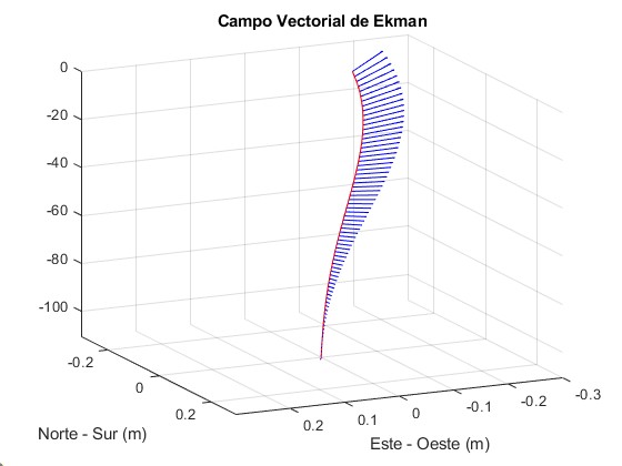 donde [math]\vec{i}[/math] apunta al este, [math]\vec{j}[/math] al norte, y 𝑧 es la profundidad (con 𝑧 ≤ 0, siendo 𝑧 = 0 la superficie). Las componentes 𝑢(𝑧) y 𝑣(𝑧) satisfacen las ecuaciones de Ekman: