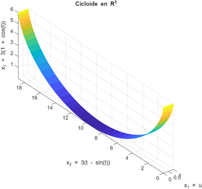 De esta forma, se aprecia que [math]x_{1}[/math] varía entre 0 y 1. Por otra parte,[math]x_{2}[/math] y [math]x_{3}[/math] están relacionados mediante la ecuación de la cicloide dada en R3, que ya está parametrizada en función de t. Se asignan el parámetro u a [math]x_{1}[/math].