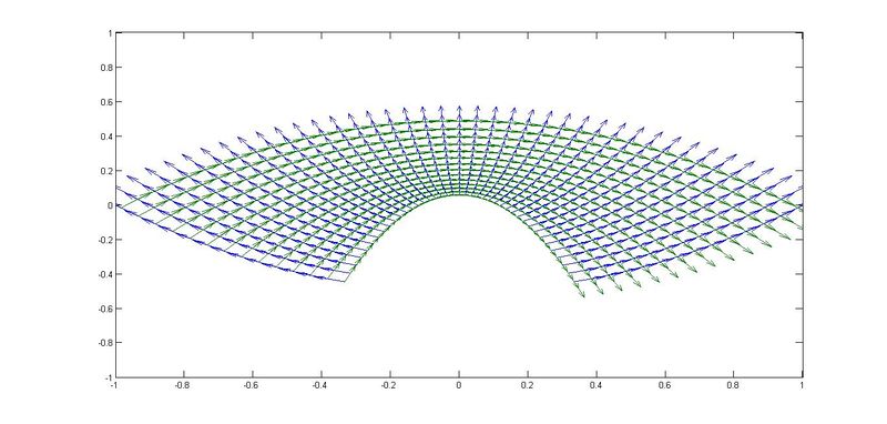Con todo esto: [math]\vec{u}= \frac{\vec{g}_u}{|\vec{g_u}|}(-4 \frac{\vec{g}_u}{|\vec{g_u}|} \vec{r_o})= \frac{\vec{g_u}}{|\vec{g_u}|^2}(-4 \vec{g_u}\cdot\vec{r_o})=\frac{-4uv^2-2u(u^2-v^2)}{u^2+v^2} \vec{g_u}=-4(\frac{uv^2+u^3}{2})\frac{\vec{g_u}}{u^2+v^2}=-2u\vec{g_u}=-2uv \hat{e_1} -2u^2 \hat{e_2}[/math] La representación del campo de desplazamiento [math]\vec{u}[/math] será la siguiente: