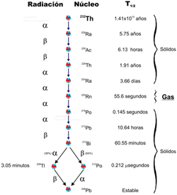 Cuando una sustancia se desintegra radiactivamente, por lo general no solo se transmuta en en una sustancia estable (con lo que se detiene el proceso), sino que la primera sustancia se desintegra, forma otra sustancia radiactiva y ésta, a su vez, decaer y forma una tercera sustancia, etc.