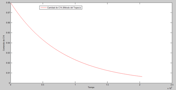 El próximo cálculo realizado determinará cuanto tiempo tarda la muestra de C14 restante (8%) en reducirse hasta el 8% (es decir, el 0,64% del total). Para ello se utiliza el método del trapecio (Método implícito).