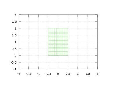 Consideramos una placa rectangular plana (en dimensión 2) que ocupa la región <math> [-1/2,1/2] \times [0,2]</math>. En ella vamos a suponer que tenemos definidas dos cantidades físicas: la temperatura <math>T(x,y,t)</math>, que depende de las dos variables espaciales <math>(x,y)</math> y el tiempo <math>t</math>, y los desplazamientos <math>\vec u(x,y,t)</math>. De esta forma, si definimos <math>r_0(x,y)</math> el vector de posición de los puntos de la placa en reposo, la posición de cada punto <math>(x,y)</math> de la placa en un instante de tiempo <math>t</math> viene dada por: | Consideramos una placa rectangular plana (en dimensión 2) que ocupa la región <math> [-1/2,1/2] \times [0,2]</math>. En ella vamos a suponer que tenemos definidas dos cantidades físicas: la temperatura <math>T(x,y,t)</math>, que depende de las dos variables espaciales <math>(x,y)</math> y el tiempo <math>t</math>, y los desplazamientos <math>\vec u(x,y,t)</math>. De esta forma, si definimos <math>r_0(x,y)</math> el vector de posición de los puntos de la placa en reposo, la posición de cada punto <math>(x,y)</math> de la placa en un instante de tiempo <math>t</math> viene dada por: | ||
