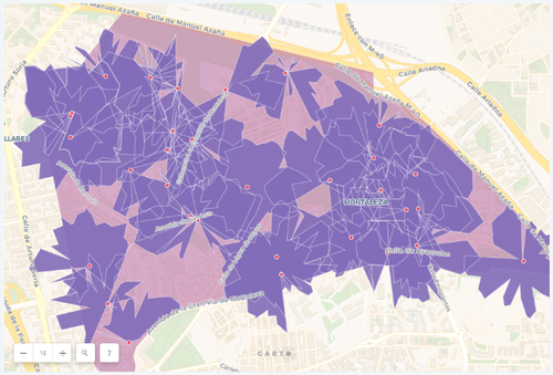 Como alternativa, se intentó realizar directamente en Carto un análisis “Create Tavel/distance buffers”, que crea una capa de isolíneas de tiempo desde cada polideportivo, pero los resultados obtenidos no eran coherentes (como se puede observar en la imagen). | Como alternativa, se intentó realizar directamente en Carto un análisis “Create Tavel/distance buffers”, que crea una capa de isolíneas de tiempo desde cada polideportivo, pero los resultados obtenidos no eran coherentes (como se puede observar en la imagen). | ||