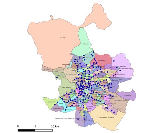 Mediante este indicador lo que pretendemos medir es como han cambiado la actividad de los diferentes barrios a lo largo de los últimos años. En los barrios gentrificados lo que ocurre es que los usos existentes se ven modificados por otros más lucrativos, esto puede significar un cambio de uso residencial a terciario y una proliferación de los negocios o, por el contrario, un cambio de usos terciarios a residencial algo que suele ir unido a una proliferación del alquiler. Los datos necesarios para realizar este indicador proceden del catastro. Estos datos son distintas hojas de Excel con el número de inmuebles por uso y por barrio (un Excel por año), como lo que necesitamos es conocer la variación en el número de inmuebles de uso residencial y terciario sobre el total de inmuebles por barrio a lo largo de los años usamos la función de unir tablas en QGIS para poder ver esta evolución.