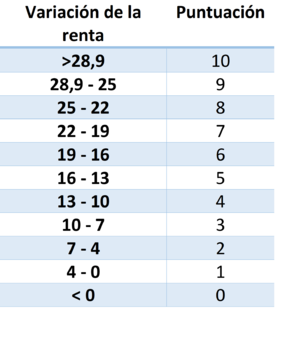 | − | [[Archivo:renta1|miniaturadeimagen|izquierda|Puntuación en función de la variación de la renta ]] | + | [[Archivo:renta1.png|miniaturadeimagen|300px|izquierda|Puntuación en función de la variación de la renta ]] |