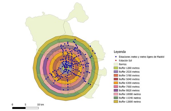 Mediante una tabla dinámica en Excel obtenemos el número de estaciones existentes en cada barrio y se calcula el cociente entre el número de estaciones por barrio y el área del barrio en kilómetros cuadrados, obteniendo la densidad de estaciones por barrio. Para realizar una mejor aproximación de la accesibilidad será necesario aplicar una corrección a la densidad calculada anteriormente en función de la lejanía de la estación respecto del centro de Madrid (estación de Sol). Para obtener el factor de corrección hacemos buffers cada 1260 metros con centro en la estación de Sol y se le asigna a cada estación un coeficiente de 0 a 1 en función del buffer en el que se encuentre la estación en cuestión. De esta forma el coeficiente será 1 en las estaciones cercanas al centro de Madrid y 0.1 en las estaciones más alejadas. A continuación, se calcula mediante una tabla dinámica el promedio de los coeficientes asignados a las estaciones pertenecientes a un mismo barrio, obteniendo el factor de corrección. Finalmente, este factor se multiplica por la densidad de estaciones calculada anteriormente. Hemos decidido incluir este factor de corrección puesto que, evidentemente, cuanto mayor sea la distancia geometría de las estaciones al kilómetro cero, menor será la accesibilidad que aportan, puesto que es en el centro de la ciudad donde más líneas de metro tienen parada.